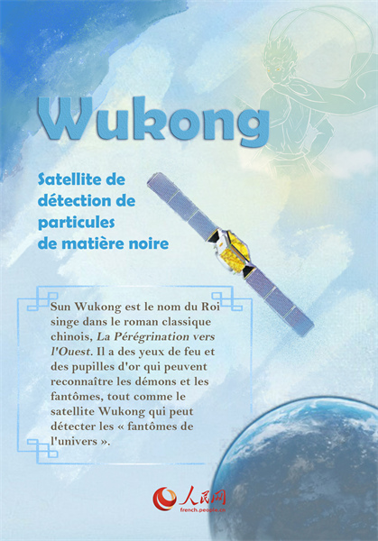 Le 16 décembre 2015, le satellite de détection de particules de matière noire a été nommé ? Wukong ?. Sun Wukong est le nom du Roi singe dans le classique chinois, La Pérégrination vers l'Ouest. Il a des yeux de feu et des pupilles d'or et peut distinguer les démons et les fant?mes. La matière noire est surnommée le ? fant?me de l'univers ? qui est difficile à détecter. Le satellite de détection de particules de matière noire s'appelle Wukong, tout comme les ? fant?mes de l'univers ? détectés par les yeux de feu du Roi singe. De plus, ? wu ? signifie comprendre, ? kong ? signifie le ciel et l'univers, donc ? Wukong ? revêt également un sens de comprendre et d'explorer l'espace universel.