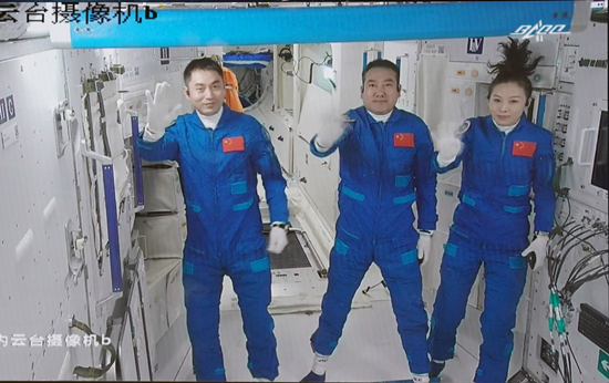 Capture d'écran prise au centre de contr?le aérospatial de Beijing le 16 octobre 2021 montrant l'équipage de la mission Shenzhou-13 dans la station spatiale Tiangong, entreprenant son voyage de six mois à l'intérieur de la station dans le plus long vol spatial du pays. (Photo/Xinhua)