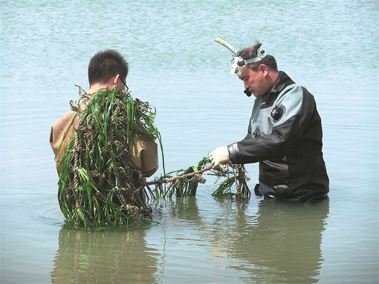 Zhang Peidong (à droite) se prépare à planter des herbiers dans la baie de Laizhou, dans la province du Shandong (est de la Chine), avec l'un des membres de son équipe. (Photo/China Daily)