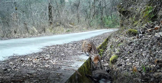 Selon le Centre de conservation de Laohegou du comté de Pingwu, dans le Parc national du panda géant, une caméra infrarouge placée sur le bord de la route a capturé avec succès le 29 mars des images précieuses en haute définition d'un chat doré d'Asie, ou chat de Temminck, en train de se repa?tre. La vidéo montre un chat doré pie mordant dans un cerf huppé sauvage dans un fossé au bord d'une route dans une zone boisée.