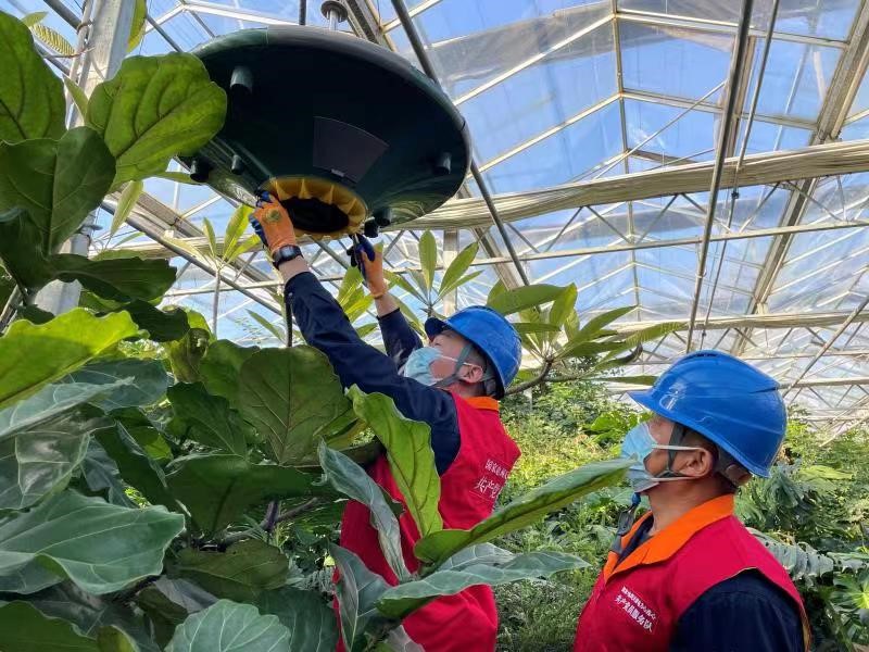 Des personnels de la filiale de State Grid Tianjin Electric Power Company dans l'arrondissement de Baodi installent des équipements agricoles intelligents dans une serre. (Photo / cpnn.com.cn)
