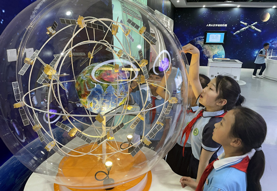 Des étudiants découvrent une maquette de démonstration du système de navigation par satellite Beidou dans un musée des sciences à Jinan, capitale de la province du Shandong (est de la Chine). (Photo / Xinhua)