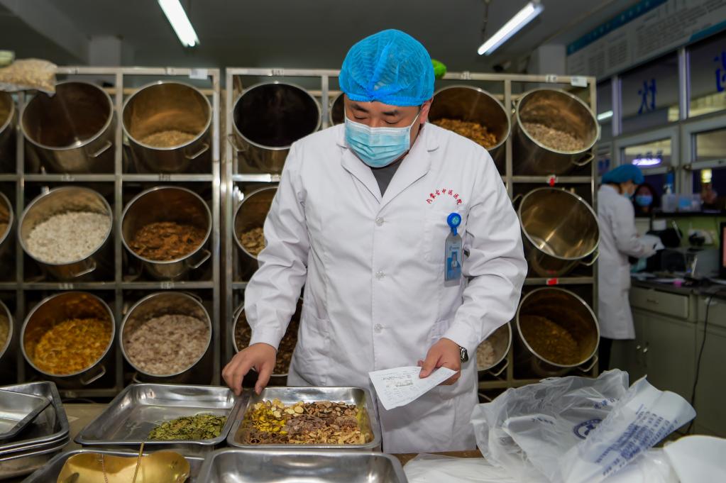 Le 25 février, un pharmacien de l'h?pital de médecine traditionnelle chinoise de Mongolie intérieure vérifie la prescription de la médecine traditionnelle chinoise. (Li Zhipeng / Xinhua)