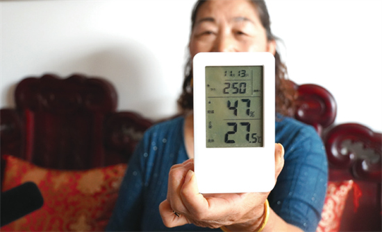 Le 13 novembre 2021, une habitante de la ville de Haiyang de la province du Shandong (dans l'est de la Chine) montre la température ambiante réellement mesurée chez elle. (Photo prise par Jing Yi)