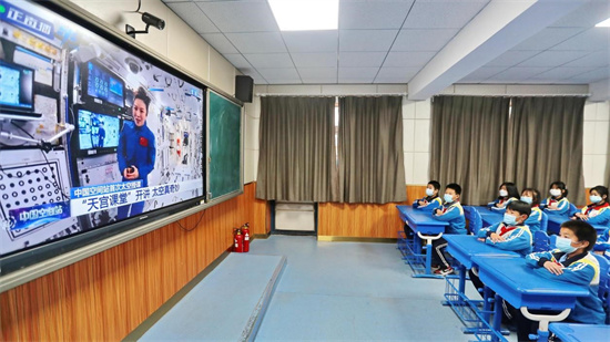 Le 9 décembre 2021, dans le bourg de Donggang de l'arrondissement de Haigang de la ville de Qinhuangdao de la province du Hebei (dans le nord de la Chine), des élèves d'une école primaire suivent un cours donné depuis l'espace par l'astronaute Wang Yaping. (Cao Jianxiong/Pic.people.com.cn)