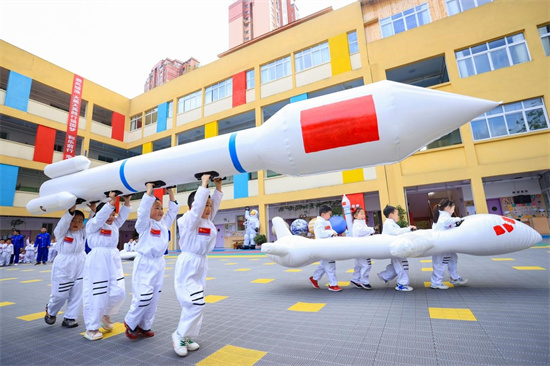 Le 22 mars 2022, des élèves vivent une expérience d'exploration spatiale lors d'une activité organisée par une école maternelle dans le comté de Daying de la ville de Suining de la province du Sichuan (dans le sud-ouest de la Chine). (Liu Changsong/Pic.people.com.cn)