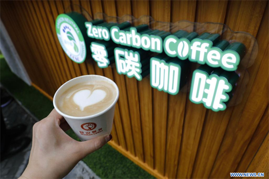 Un membre du personnel montre une tasse de café zéro carbone dans un parc de loisirs du Forum de Boao pour l'Asie (FBA), à Boao, dans la province de Hainan (sud de la Chine), le 20 avril 2022. Le FBA tient sa conférence annuelle du 20 au 22 avril à Boao, ville c?tière de Hainan. La reprise verte et le développement durable figurent parmi les thèmes de la conférence. (Xinhua/Yang Guanyu)