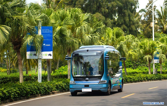 Une navette autonome à énergie nouvelle participe à des essais sur route près du site du Forum de Boao pour l'Asie (FBA), à Boao, dans la province de Hainan (sud de la Chine), le 16 avril 2022. Le FBA tient sa conférence annuelle du 20 au 22 avril à Boao, ville c?tière de Hainan. La reprise verte et le développement durable figurent parmi les thèmes de la conférence. (Photo/Xinhua)