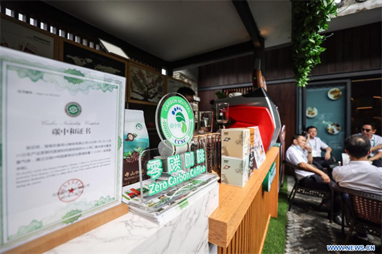 Des invités dégustent du café zéro carbone dans un parc de loisirs du Forum de Boao pour l'Asie (FBA), à Boao, dans la province de Hainan (sud de la Chine), le 20 avril 2022. Le FBA tient sa conférence annuelle du 20 au 22 avril à Boao, ville c?tière de Hainan. La reprise verte et le développement durable figurent parmi les thèmes de la conférence. (Xinhua/Zhang Liyun)