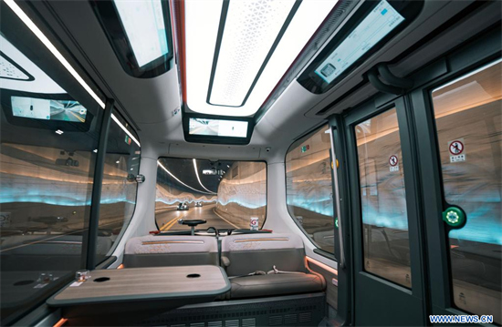 Une navette autonome à énergie nouvelle circule dans un tunnel près du site du Forum de Boao pour l'Asie (FBA), à Boao, dans la province de Hainan (sud de la Chine), le 16 avril 2022. Le FBA tient sa conférence annuelle du 20 au 22 avril à Boao, ville c?tière de Hainan. La reprise verte et le développement durable figurent parmi les thèmes de la conférence. (Photo/Xinhua)