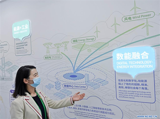 Une exposante présente un système d'intégration technologie-énergie numérique capable d'utiliser efficacement l'énergie à Boao, dans la province de Hainan (sud de la Chine), le 20 avril 2022. Le FBA tient sa conférence annuelle du 20 au 22 avril à Boao, ville c?tière de Hainan. La reprise verte et le développement durable figurent parmi les thèmes de la conférence. (Xinhua/Ding Hongfa)