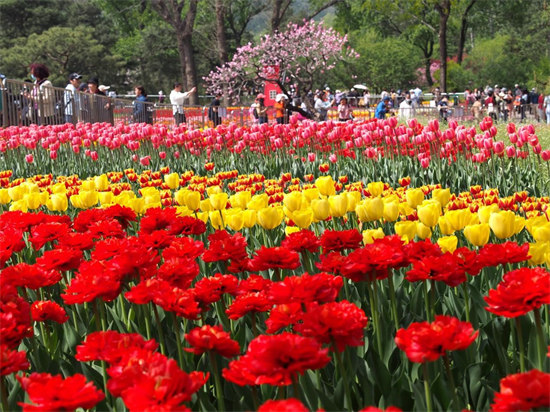 Le 19 avril 2022, des visiteurs apprécient des tulipes au jardin botanique national de Chine à Beijing. (Du Jianpo / Pic.people.com.cn)