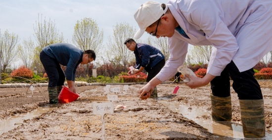 Des membres du personnel du Centre de recherche et de développement du riz marin de Qingdao sèment des riz de mer. (Photo / Centre de recherche et de développement du riz marin de Qingdao)
