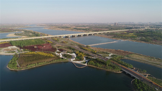 Vue aérienne d'une section de la rivière Hutuo, à Shijiazhuang, dans la province chinoise du Hebei (nord), le 13 avril 2021. La qualité de l'eau et l'écosystème de la rivière Hutuo ont été améliorés grace aux efforts de restauration écologique. (Xinhua/ Yang Shiyao)