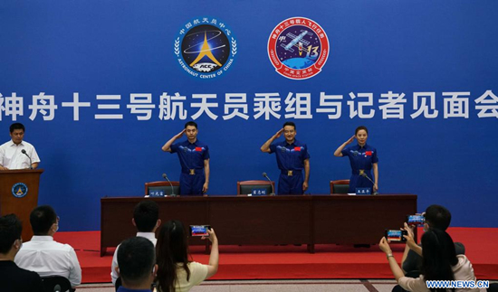 Le Ye Guangfu (2e à gauche), Zhai Zhigang (2e à droite) et Wang Yaping (1ère à droite), astronautes de la mission habitée chinoise Shenzhou-13, rencontrent la presse à Beijing, le 28 juin 2022. (Photo : Guo Zhongzheng)