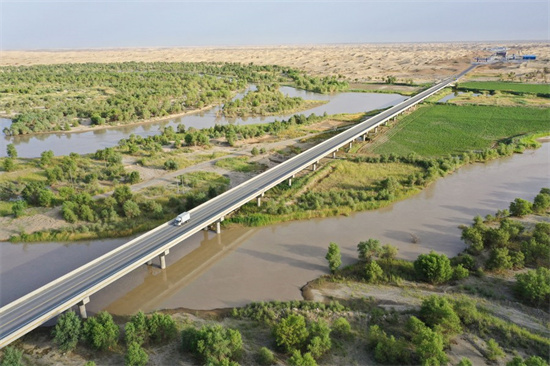 Photo aérienne montrant une section d'une nouvelle autoroute du désert traversant le désert du Taklimakan au-dessus de la rivière Tarim dans la région autonome ou?ghoure du Xinjiang (nord-ouest de la Chine), le 22 juin 2022. (Xinhua/Li Xiang)