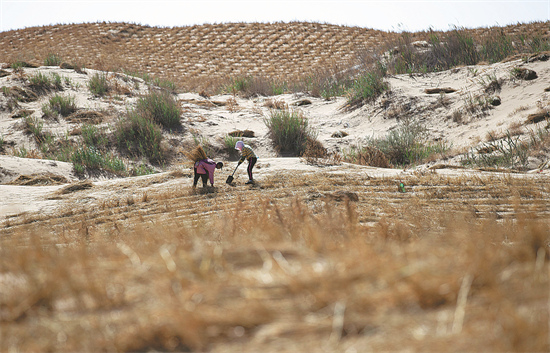 Des travailleurs de la lutte contre la désertification fabriquent des barrières en damiers de paille près de la frontière du désert de Maowusu à Lingwu, dans la région autonome Hui du Ningxia (nord-ouest de la Chine), en juin. (Photo / Xinhua)