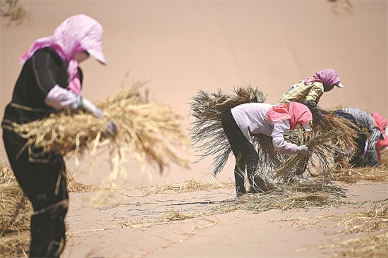 Des ouvriers de lutte contre la désertification fabriquent des barrières de paille dans un désert près de Wuwei, dans la province du Gansu, le 16 juin. (Photo / Xinhua)
