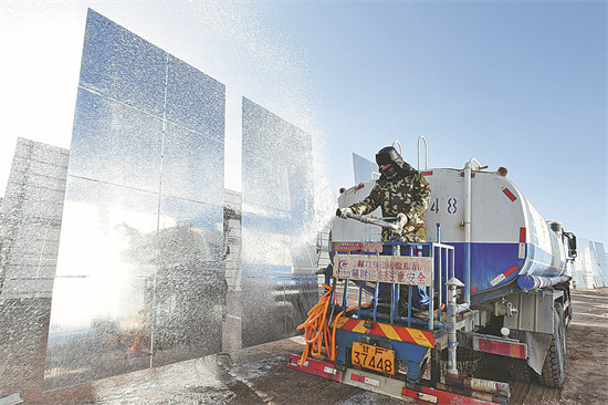 Un ouvrier nettoie des miroirs dans une centrale solaire thermique au sel fondu à Yumen, dans la province du Gansu (nord-ouest de la Chine), en décembre. (Photo / Xinhua)