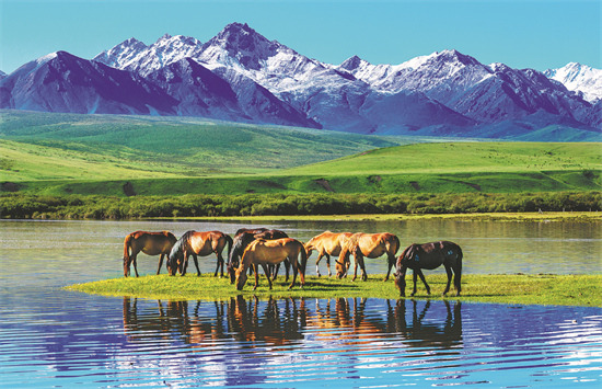 Les chevaux paissent dans les paturages au pied des monts Qilian, dans la province du Gansu. (Photo / China Daily)