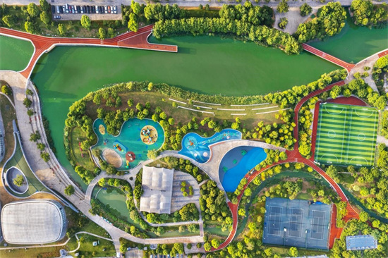 Le 14 ao?t 2022, la photo aérienne montre un parc sportif dans l'arrondissement de Zhenhai de la ville de Ningbo de la province du Zhejiang (dans l'est de la Chine). (Hu Xuejun/Pic.people.com.cn)