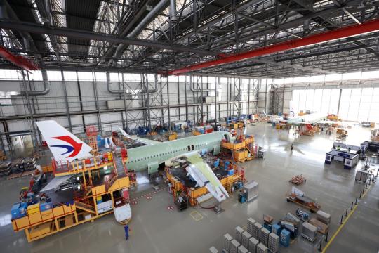 La cha?ne de montage de la famille d'avions Airbus A320 à Tianjin (nord de la Chine). (Photo / Xinhua)