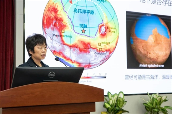 Chen Ling, chercheur à l'Institut de géologie et de géophysique de l'Académie chinoise des sciences, explique les découvertes du rover Zhurong lors d'une conférence de presse. (Photo fournie par l'Institut de géologie et de géophysique de l'Académie chinoise des sciences via Xinhua)