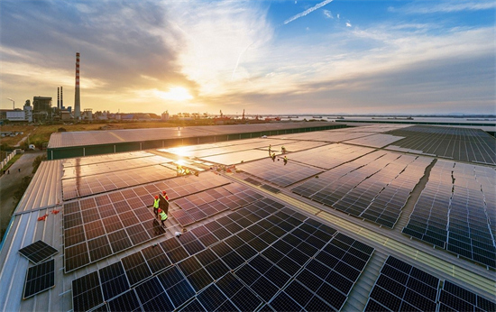 La société China Baowu European Metallurgical Chain Gold Base, située sur le fleuve Yangtsé à Maanshan, dans la province de l'Anhui (est de la Chine), installe un équipement solaire photovolta?que sur le toit en novembre 2021. (Zhang Mingwei / Pic.people.com.cn)