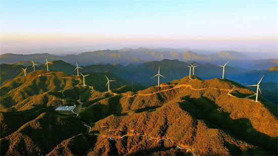 Un générateur de typhon installé dans la centrale éolienne de Panguzhang, dans le canton de Qingxi du comté de Huichang, à Ganzhou, dans la province du Jiangxi (est de la Chine), magnifique face au coucher du soleil en novembre 2021. (Zhu Haipeng / Pic.people.com.cn)