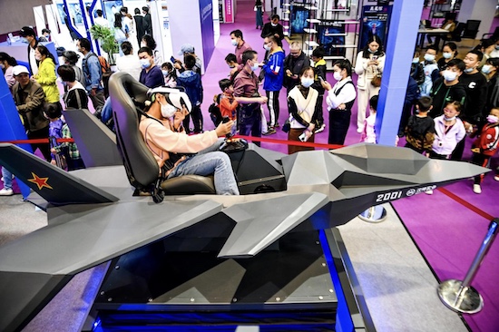 Un enfant expérimente un avion contr?lé par la réalité virtuelle lors de la Conférence mondiale de l'industrie de la réalité virtuelle 2022, le 13 novembre 2022. (Bao Gansheng / Pic.people.com.cn)
