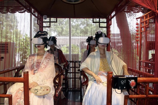 Des touristes vêtues de vêtements chinois traditionnels font l'expérience du pavillon de réalité virtuelle du jardin Zhuozheng à Suzhou, dans la province du Jiangsu (est de la Chine), le 26 juillet 2022. (Wang Jiankang / Pic.people.com.cn)