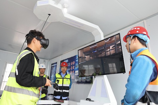 Des travailleurs de la construction participent à une expérience dans le hall d'expérience d'éducation à la sécurité en réalité virtuelle, sur le chantier de construction du projet d'accueil des petites et moyennes entreprises de Chongqing (sud-ouest de la Chine), le 29 mai 2022. (Sun Kaifang / Pic.people.com.cn)