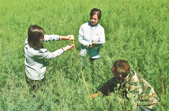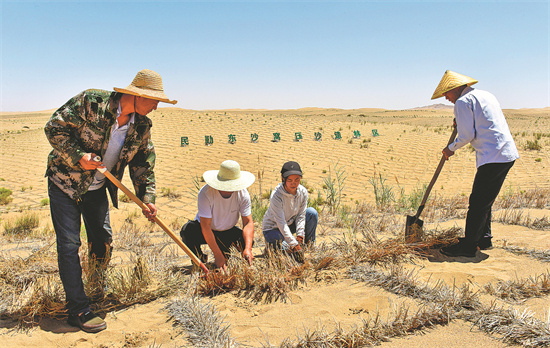 Jiang Liling (au centre) et ses collègues vérifient la croissance des arbustes qu'ils ont plantés sur l'ancienne terre sablonneuse. (Photo / China Daily)