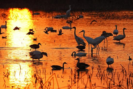 Des oiseaux migrateurs se reposent au sanctuaire de grues sibériennes Cinq Etoiles de Nanchang près du lac Poyang à Nanchang, capitale de la province du Jiangxi (est de la Chine), le 21 décembre 2022. Le lac Poyang, le plus grand lac d'eau douce du pays, est un lieu d'hivernage important pour les oiseaux migrateurs. (Xinhua/Wan Xiang)