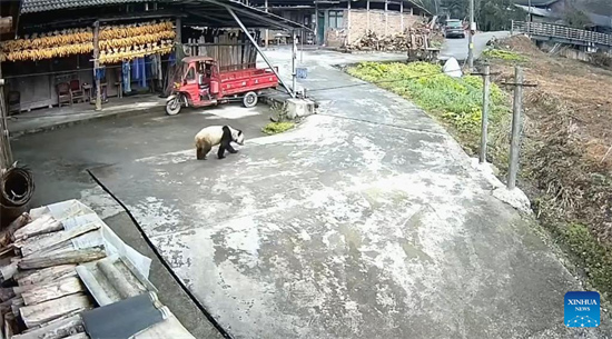 Capture d'écran d'une vidéo montrant un panda géant sauvage déambulant dans le village de Xiaohe du comté de Lushan, à Ya'an, dans la province du Sichuan (sud-ouest de la Chine), le 5 janvier 2023. (Photo / Xinhua)