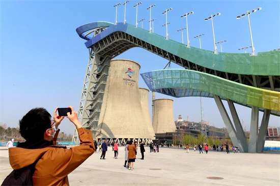 Des touristes prennent des photos devant le site de Big Air Shougang à Beijing. (He Luqi/Pic.people.com.cn)