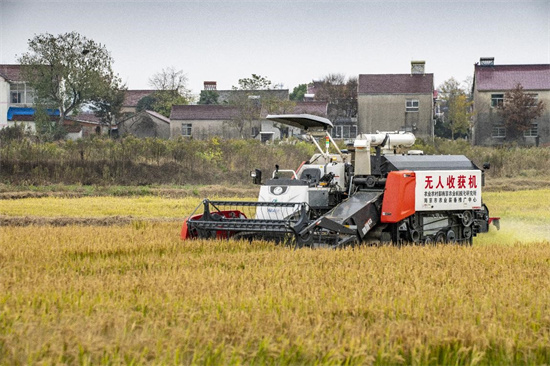 Le 23 novembre 2022, des machines intelligentes de récolte de riz sans conducteur équipée des services de navigation Beidou travaillent à haute efficacité dans une base de riz tardif dans le bourg de Baima de l'arrondissement de Lishui de la ville de Nanjing de la province du Jiangsu (dans l'est de la Chine). (Zhu Hongsheng / Pic.people.com.cn)