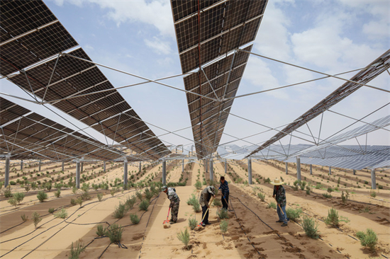 Dans la zone désertique d'aujourd'hui, des panneaux photovolta?ques fournissent de l'ombre aux plantes, tandis que des installations de pulvérisation efficaces et économes en eau les maintiennent en plein essor. ? L'industrie photovolta?que a été profondément intégrée aux efforts locaux de protection écologique ?, a expliqué Li Zhenhai, directeur adjoint de la Commission du développement et de la réforme de Wuwei, ajoutant que plus de 1 300 hectares de plantes du désert ont été cultivés dans le parc de démonstration photovolta?que de contr?le du sable à Wuwei, construisant une solide barrière verte pour renforcer le contr?le du sable.