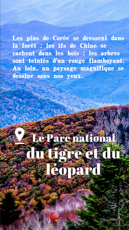 Les pins de Corée se dressent dans la forêt ; les ifs de Chine se cachent dans les bois ; les arbres sont teintés d'un rouge flamboyant. Au loin, un paysage magnifique se dessine sous nos yeux.