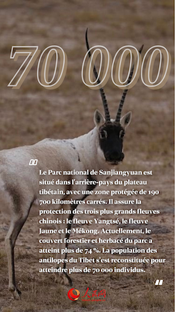 Le Parc national de Sanjiangyuan est situé dans l'arrière-pays du plateau tibétain, avec une zone protégée de 190 700 kilomètres carrés. Il assure la protection des trois plus grands fleuves chinois : le fleuve Yangtsé, le fleuve Jaune et le Mékong. Actuellement, le couvert forestier et herbacé du parc a atteint plus de 74 %. La population des antilopes du Tibet s'est reconstituée pour atteindre plus de 70 000 individus.