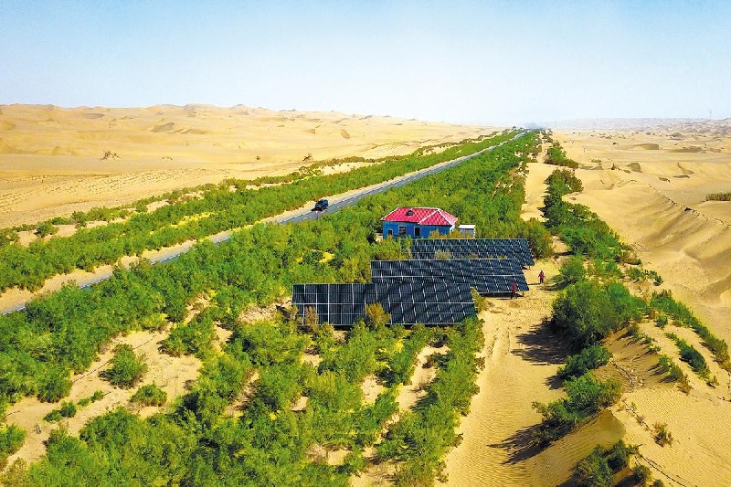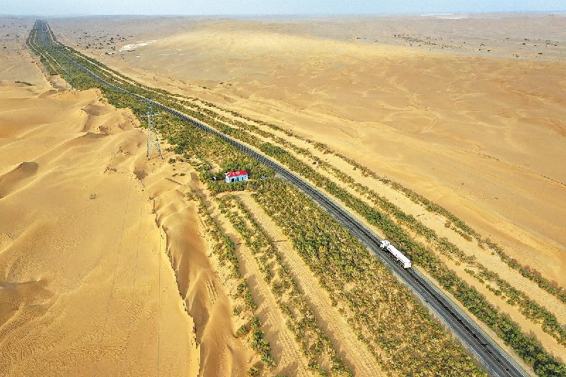 Pour lutter contre l'avancée du sable le long de la route, le champ pétrolifère du Tarim de la CNPC déploie depuis 2003 des efforts considérables pour construire et entretenir la ceinture verte protectrice – longue de 436 km et large de 75 mètres – de chaque c?té de la route. Grace à l'irrigation goutte à goutte, les eaux souterraines sont utilisées pour nourrir les espèces résistantes à la sécheresse, comme l'Haloxylon ammodendron et le Calligonum mongolicum.