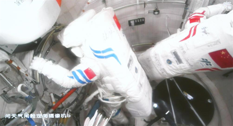 Chen Dong et Wang Jie, en charge des opérations de sortie dans l'espace, ont achevé l'installation de dispositifs de protection contre les débris et d'équipements auxiliaires extravéhiculaires, ainsi que l'inspection et la maintenance des équipements externes, selon la CMSA.